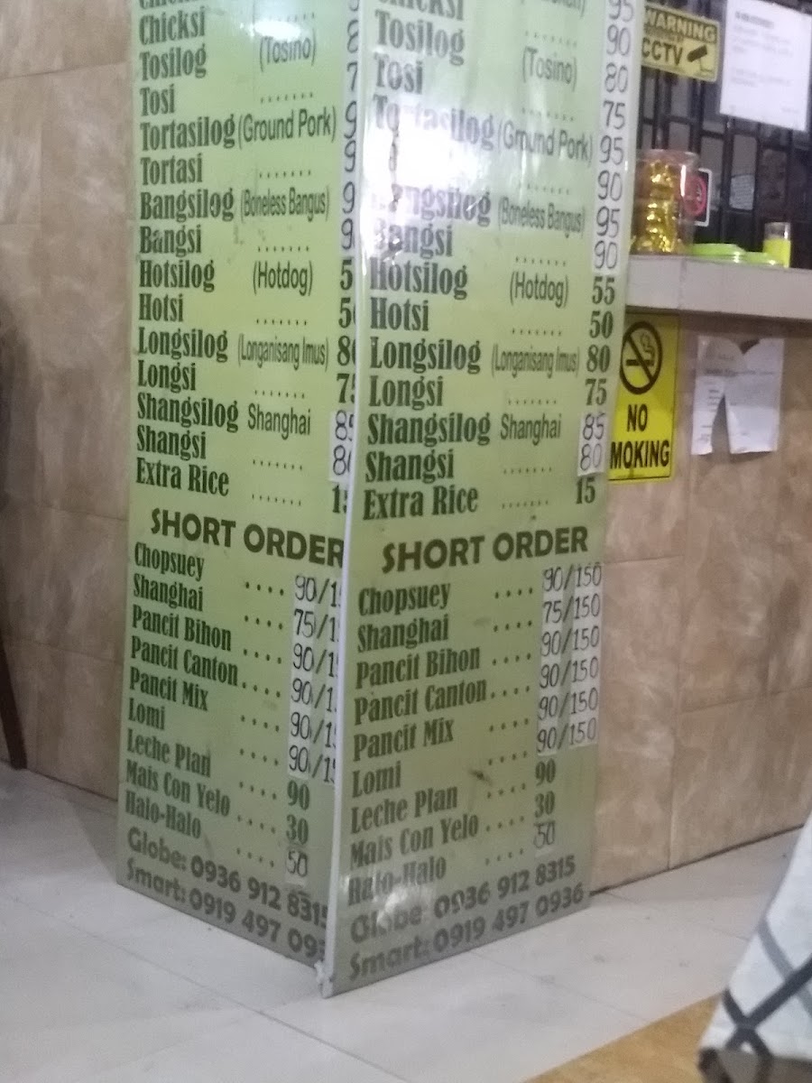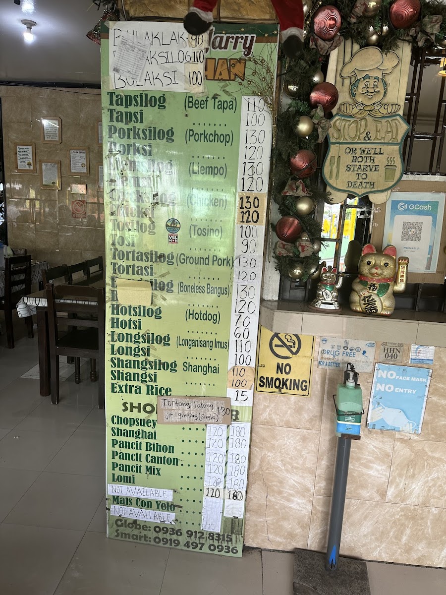 The menu highlights include simple yet hearty plates like Bangsilog and Porksilog, alongside comforting add-ons such as Extra Rice and a side of Chopsuey. These dishes reflect the everyday tastes of a casual tapsihan where familiar flavors take center stage.